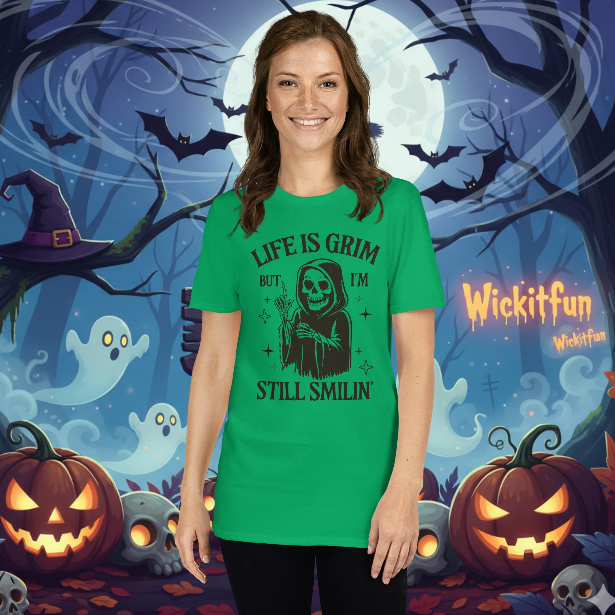 Life Is Grim But I’m Still Smilin’ Shirt | Funny Grim Reaper Halloween Tee | Dark Humor Skeleton T-Shirt -
